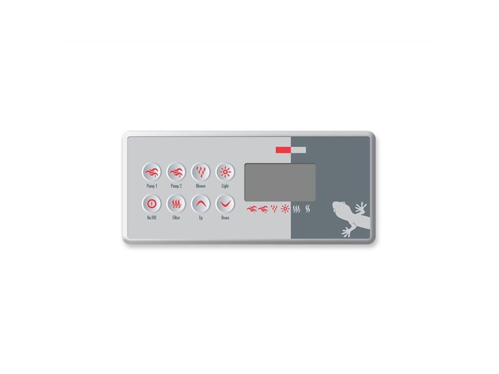 Tlačítka: | Pump 1, Pump 2, Blower, Light, On/Off, Filter, Up, Down |