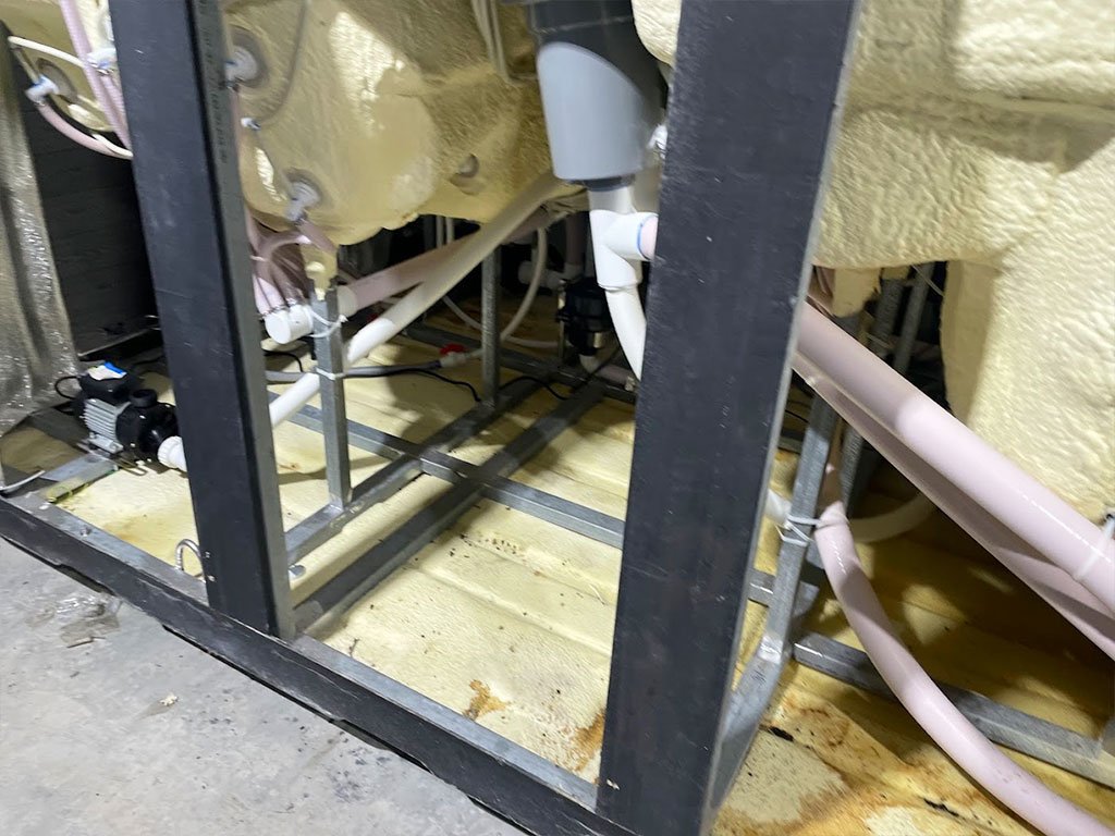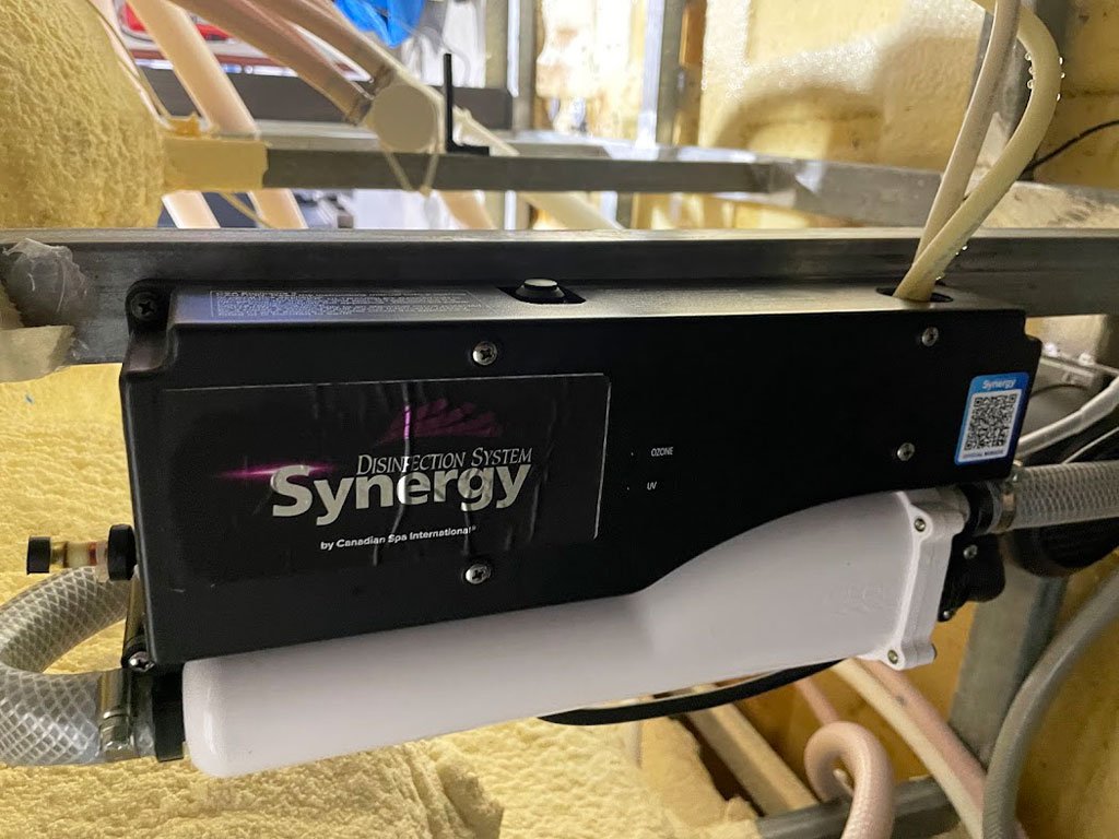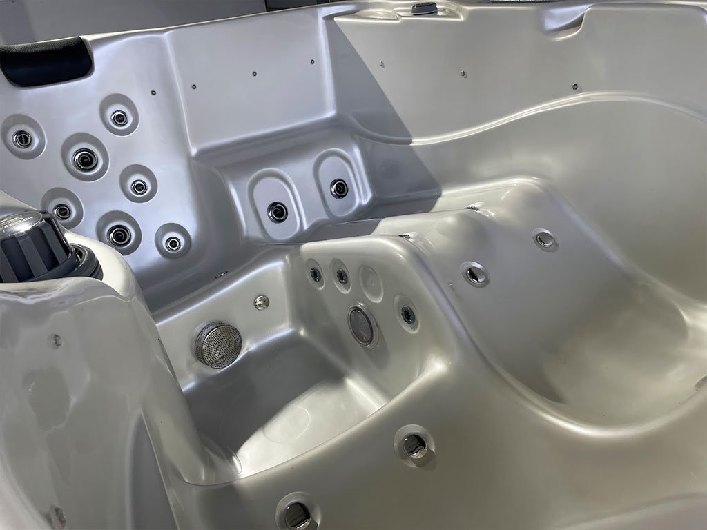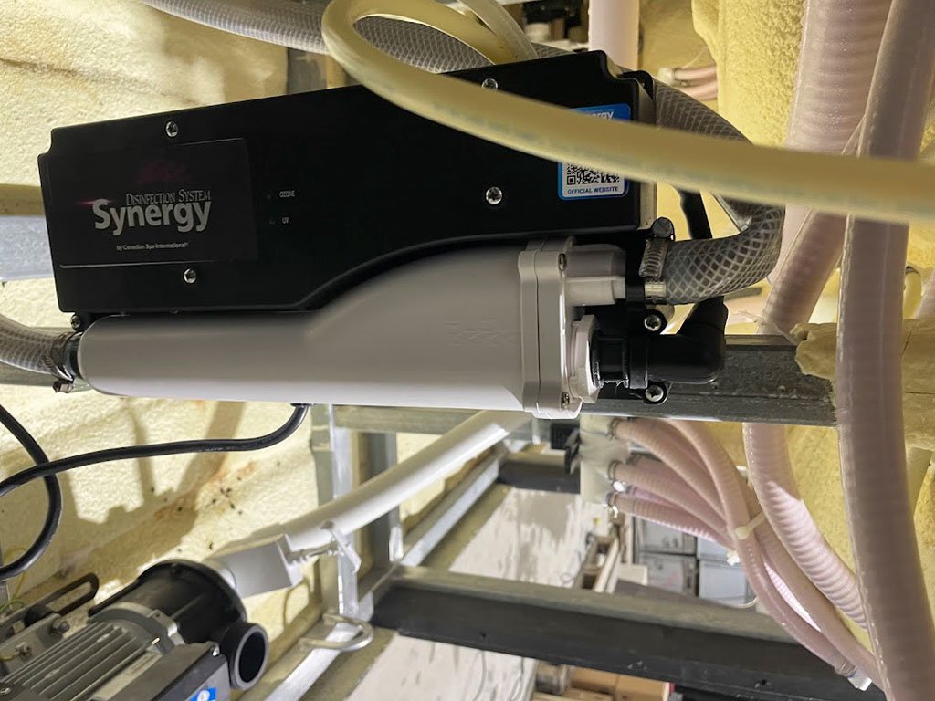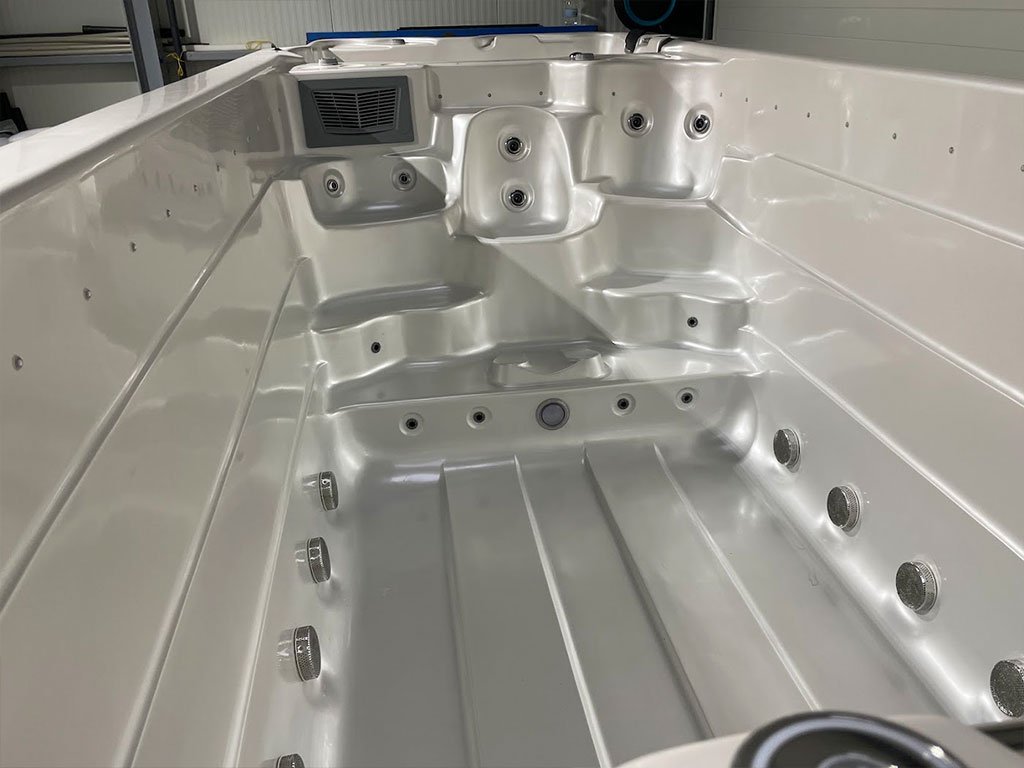 Veľké dvojzónové Swim Spa so samostatnou zónou na plávanie a relax. Dva panely Balboa SpaTouch2 a riadiaca jednotka BP2100G, ohrev 3 kW plus pomocný 3 kW pre plaveckú zónu, vodné čerpadlá 2,2 kW, cirkulácia 0,2 kW + 0,75 kW, blower 700 W a UV + SYNERGY dezinfekcia v oboch zónach. Skelet Perla, opláštenie S02 Old Wood.